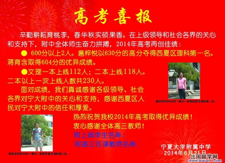 出國(guó)留學(xué)網(wǎng)高考頻道為您提供寧夏大學(xué)附屬中學(xué)2014高考成績(jī),供您參考!