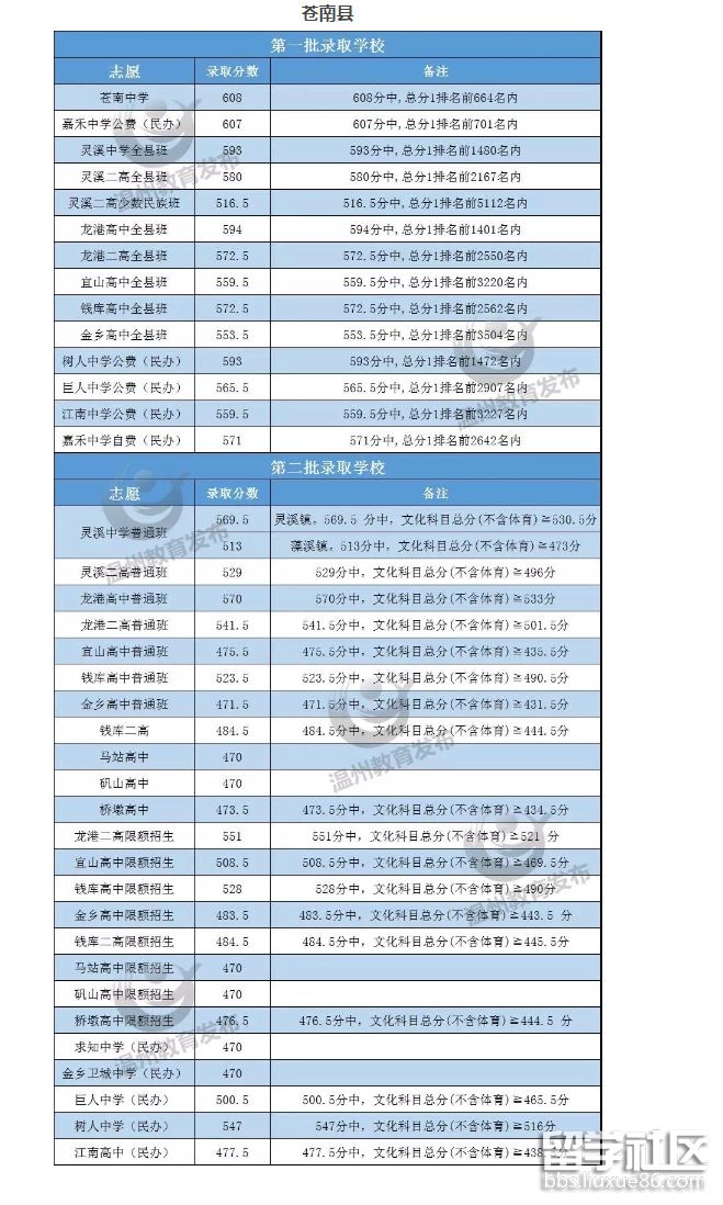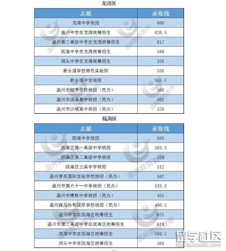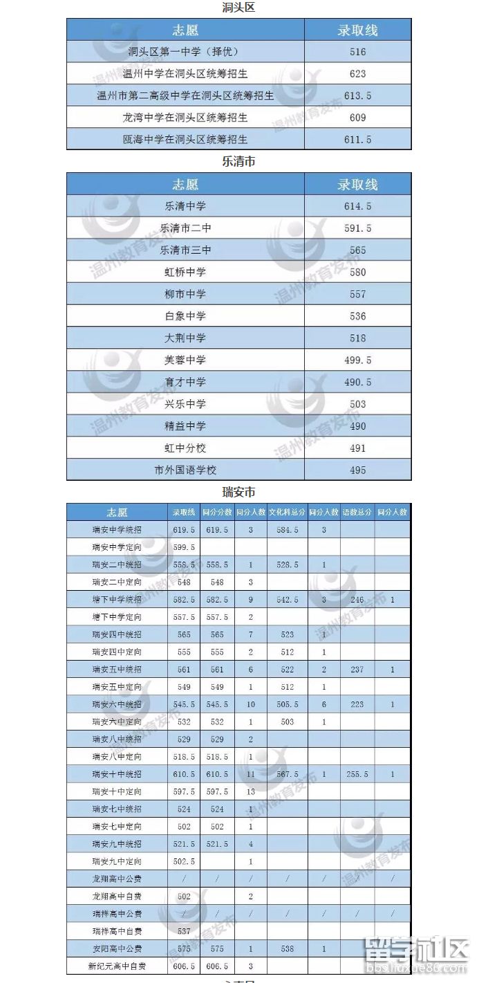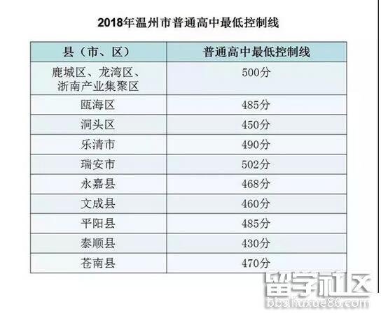 各位家長、考生請注意,浙江溫州市普通高中招生最低控制線已劃定,各縣(市、區(qū))的普通高中最低控制線見下表: