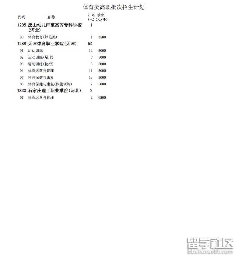 2018天津體育類高職批次招生計(jì)劃(文史類)