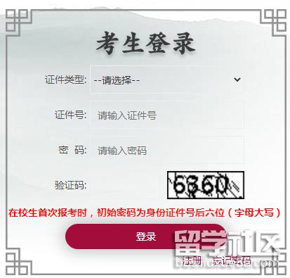 考生選擇身份證件類型,填寫身份證件號及密碼進行登錄。在校生初始密碼為身份證件號后六位,字母大寫。