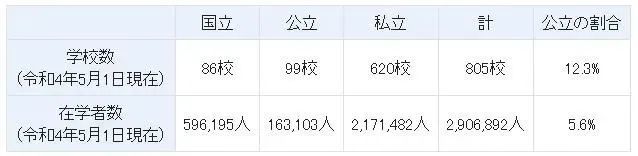 截止22年5月,日本共有805所大學(xué),其中國立大學(xué)86所、公立大學(xué)99所、私立大學(xué)620所。