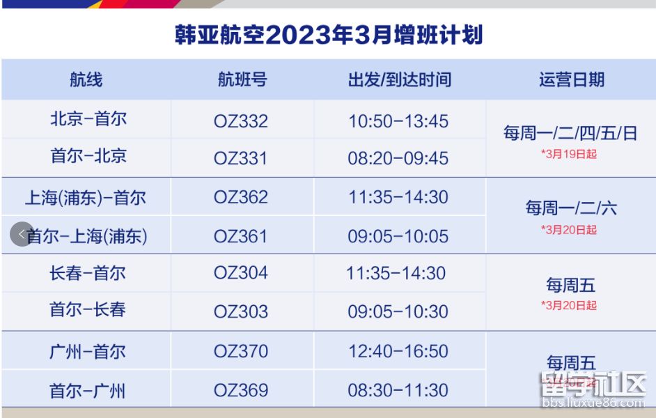 韓亞航空增班通知更新:*執(zhí)行周期3月1日-3月25日 2023年3月19日起,長春-首爾航線原(每周五)增班運營日期更改為【每周日】,其他航班運營日期不變。航班計劃受不確定因素影響可能發(fā)生變更,具體情況請以銷售系統(tǒng)顯示為準(zhǔn),以保證您的順利出行。