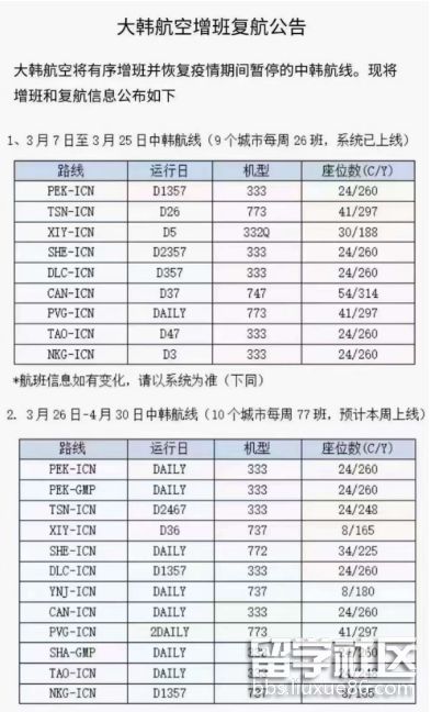 大韓航空恢復(fù)/增加航線。航線涉及北京,天津,西安,沈陽,大連,廣州,上海,青島,南京,延吉。