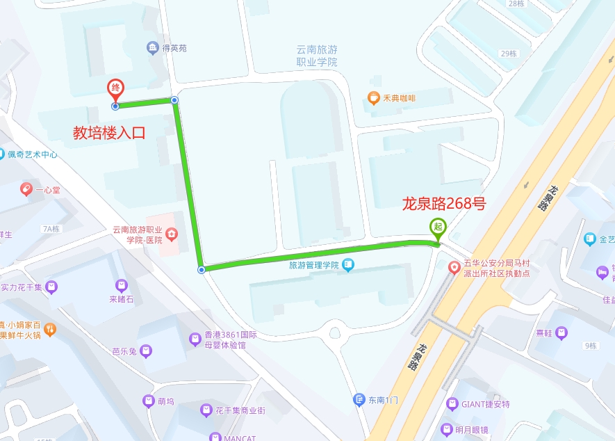 (一)應(yīng)聘人員須攜帶身份證、面試通知書(shū),在開(kāi)考前提前45分鐘到達(dá)昆明市龍泉路268號(hào)云南旅游職業(yè)學(xué)院教培樓入口處(如下圖)進(jìn)行點(diǎn)名,可乘坐129路、84路、9路、175路公交車(chē)在上馬村站下車(chē),從東南門(mén)進(jìn)入云南旅游職業(yè)學(xué)院。