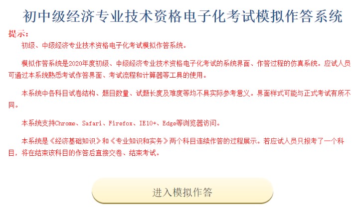 模擬作答系統(tǒng)是2020年度初級(jí)、中級(jí)經(jīng)濟(jì)專業(yè)技術(shù)資格電子化考試的系統(tǒng)界面、作答過(guò)程的仿真系統(tǒng)。應(yīng)試人員可通過(guò)本系統(tǒng)熟悉考試作答界面、考試流程和計(jì)算器等工具的使用。