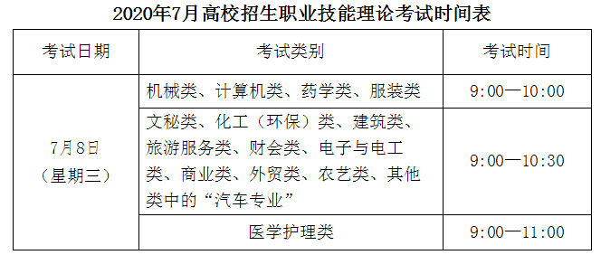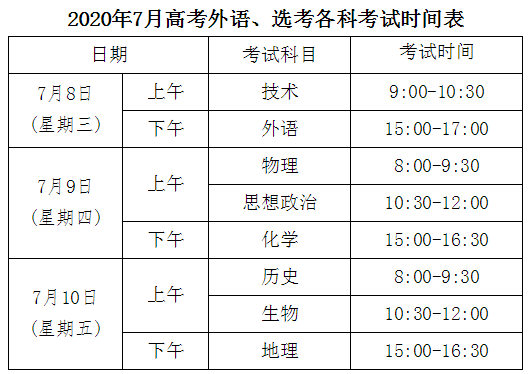 浙江杭州2020年高考外語、選考于2020年7月8日-10日進行。高校招生職業(yè)技能理論考試于2020年7月8日進行。各科考試時間見下表。