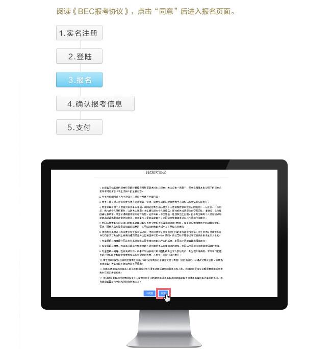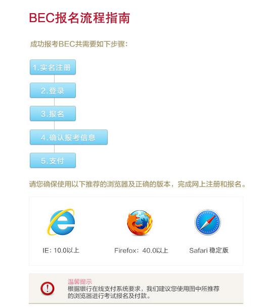 電腦系統(tǒng):劍橋商務(wù)英語(yǔ)證書(shū)考試(BEC)網(wǎng)上報(bào)名要求您使用聯(lián)接互聯(lián)網(wǎng)的電腦并裝有瀏覽器(推薦使用MicrosoftIE9、10、11和火狐最新版本)。推薦顯示分辨率設(shè)為1366*768。電腦須安裝簡(jiǎn)體中文輸入法以輸入考生中文姓名和地址。在漢字輸入狀態(tài)下,須采取半角方式輸入數(shù)字。