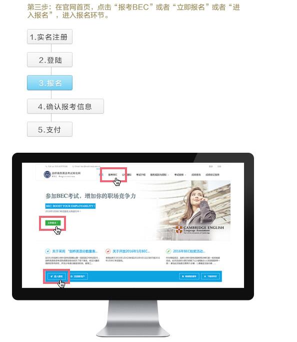 2021年5月北京商務(wù)英語(yǔ)考試報(bào)名時(shí)間為2021年2月24日10時(shí)—2021年3月10日16時(shí),2021年5月北京商務(wù)英語(yǔ)采取網(wǎng)上報(bào)名的方式??忌芍苯由暇W(wǎng)注冊(cè)個(gè)人信息,網(wǎng)上支付考費(fèi)。劍橋商務(wù)英語(yǔ)證書(shū)考試報(bào)名網(wǎng)址是http://bec.neea.edu.cn或http://bec.neea.cn。