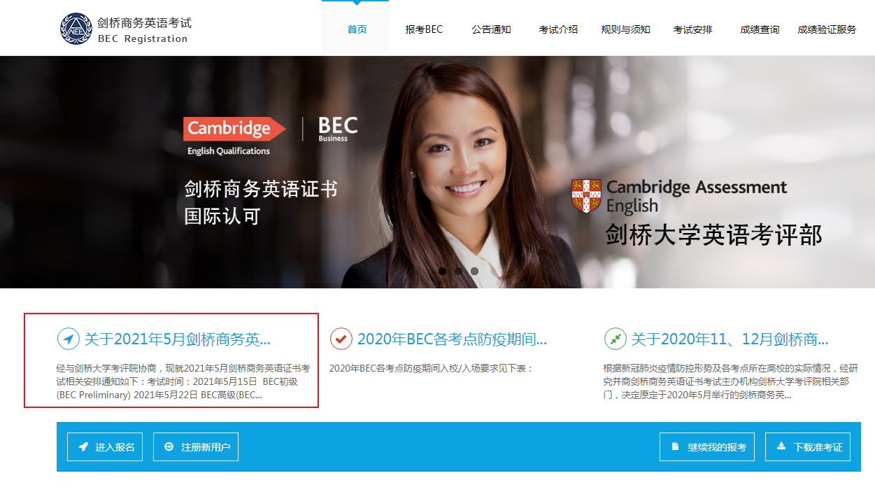 從BEC-中國(guó)教育考試網(wǎng)發(fā)布的《2021年5月劍橋商務(wù)英語(yǔ)證書(shū)考試相關(guān)安排的通知 》得知,2021年5月北京商務(wù)英語(yǔ)考試報(bào)名時(shí)間、條件、入口及流程已公布,2021年2月24日10時(shí)—2021年3月10日16時(shí)進(jìn)行報(bào)名,請(qǐng)各位考生抓緊時(shí)間報(bào)名,可報(bào)初級(jí)、中級(jí)、高級(jí)考試(溫馨提示:考生可以報(bào)考多個(gè)級(jí)別的BEC),具體詳情如下: