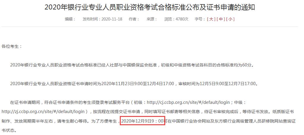 中國(guó)銀行業(yè)協(xié)會(huì)公布了“2020年銀行業(yè)專業(yè)人員職業(yè)資格考試合格標(biāo)準(zhǔn)公布及證書申請(qǐng)的通知”,新疆2020年中級(jí)銀行從業(yè)資格電子證書查詢時(shí)間為12月9日9:00,請(qǐng)符合證書申請(qǐng)條件的考生在規(guī)定時(shí)間內(nèi)完成證書申請(qǐng)。為了方便考生,2020年12月9日9:00可在中國(guó)銀行業(yè)協(xié)會(huì)網(wǎng)站及東方銀行業(yè)高級(jí)管理人員研修院網(wǎng)站查詢證書狀態(tài)。