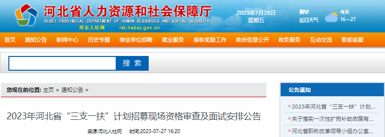 根據(jù)《關(guān)于做好2023年高校畢業(yè)生“三支一扶”計劃實施工作的通知》和《河北省2023年高校畢業(yè)生“三支一扶”計劃招募公告》要求,現(xiàn)將河北省“三支一扶”計劃招募現(xiàn)場資格審查及面試有關(guān)事項公告如下: