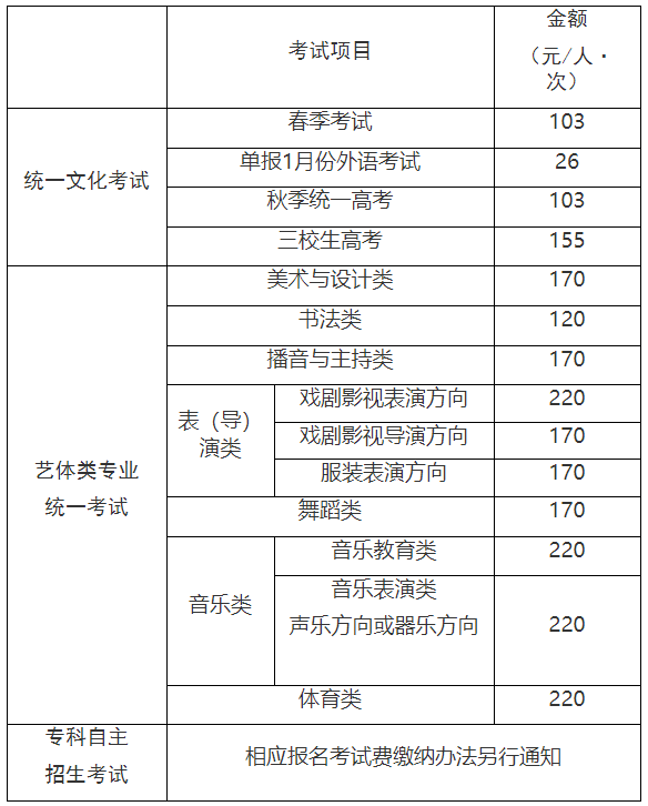 根據(jù)《關(guān)于上海市教育考試院有關(guān)考試收費(fèi)等問題的復(fù)函》(滬價(jià)費(fèi)〔2006〕005號)、《關(guān)于調(diào)整上海市教育考試院外語口語考試等收費(fèi)標(biāo)準(zhǔn)的復(fù)函》(滬價(jià)費(fèi)〔2003〕069號)文件規(guī)定,文化考試收費(fèi)標(biāo)準(zhǔn):報(bào)名費(fèi)為每項(xiàng)考試25元/人,考試費(fèi)為每項(xiàng)考試每科目26元/人;藝體類考試收費(fèi)標(biāo)準(zhǔn):報(bào)名費(fèi)為每項(xiàng)考試20元/人,考試費(fèi)為每項(xiàng)考試每科目50元/人。各類考試項(xiàng)目須繳納費(fèi)用如下表所示:
