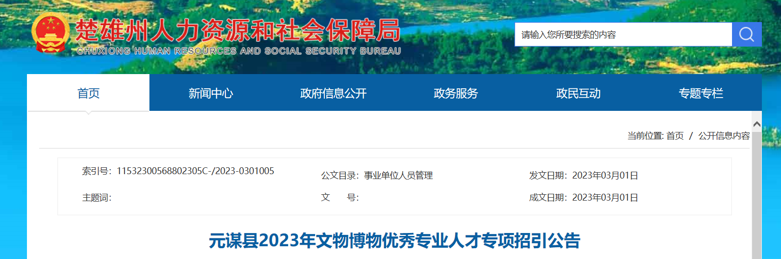 2023年云南省楚雄州元謀縣文物博物優(yōu)秀專業(yè)人才專項招引4人。報名時間:2023年3月13日8:30至2023年3月15日18:00?,F(xiàn)將公告原文發(fā)布如下: