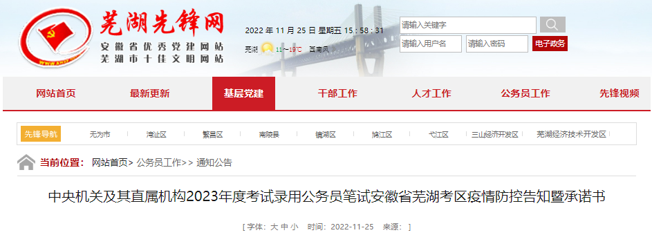 原文標題:中央機關及其直屬機構2023年度考試錄用公務員筆試安徽省蕪湖考區(qū)疫情防控告知暨承諾書