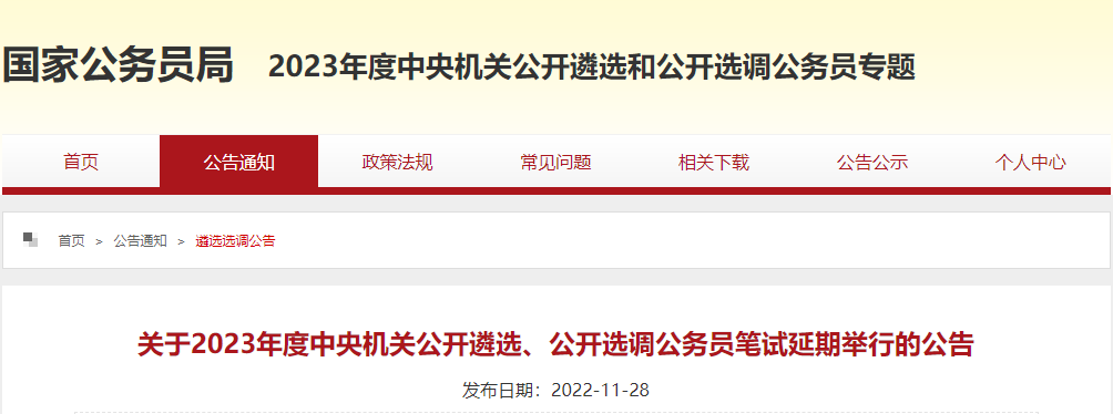 根據(jù)當(dāng)前新冠肺炎疫情情況和防控工作需要,為保障廣大考生健康安全,經(jīng)研究,原計(jì)劃于12月3日舉行的2023年度中央機(jī)關(guān)公開遴選、公開選調(diào)公務(wù)員筆試延期舉行,具體時(shí)間另行通知。
