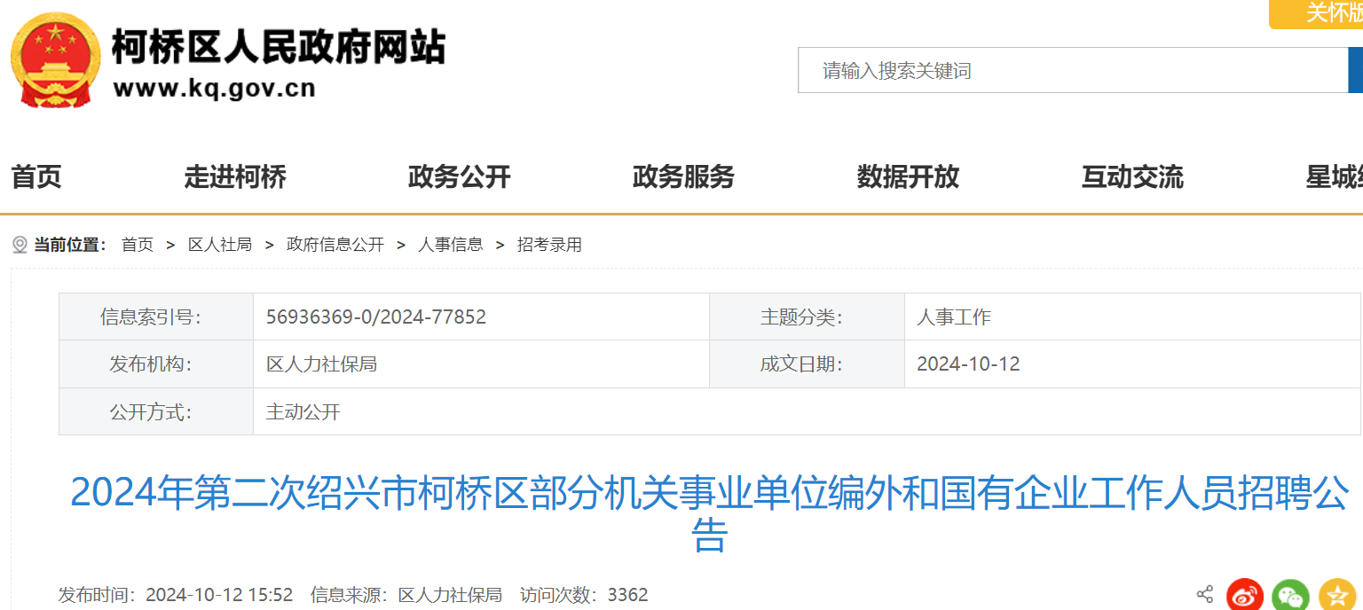小編根據(jù)紹興市柯橋區(qū)人民政府發(fā)布”2024年第二次紹興市柯橋區(qū)部分機關事業(yè)單位編外和國有企業(yè)工作人員招聘公告“得知,2024第二次浙江紹興市柯橋區(qū)部分機關事業(yè)單位編外和國有企業(yè)人員招聘70人,報名時間為2024年10月18日起。
