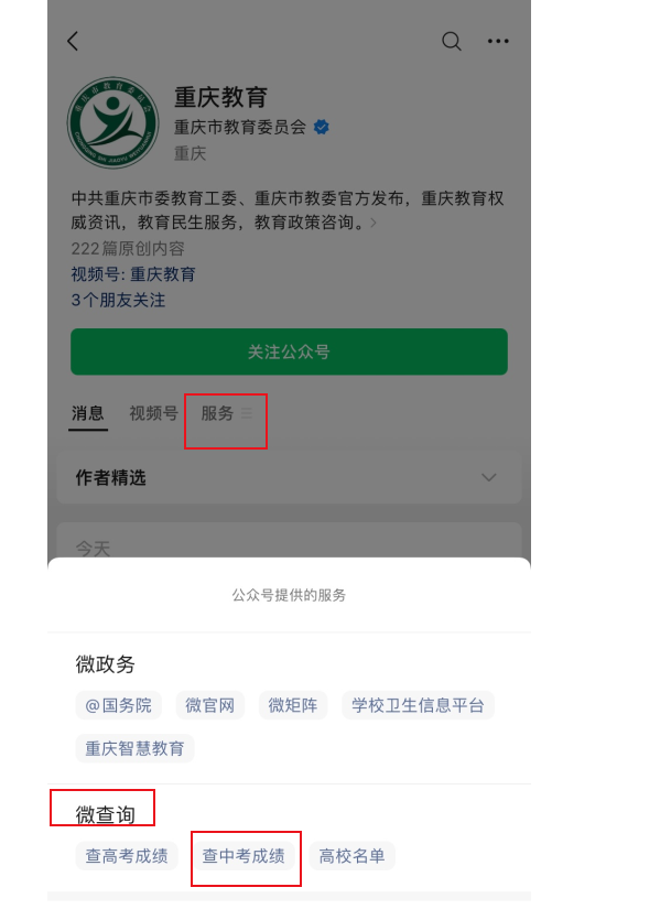 進(jìn)入【重慶教育】官方微信(ID:cqjynews)-【微查詢】-【查中考成績】,輸入考生身份證號(hào)碼和志愿填報(bào)時(shí)修改后的密碼,查詢中考成績。