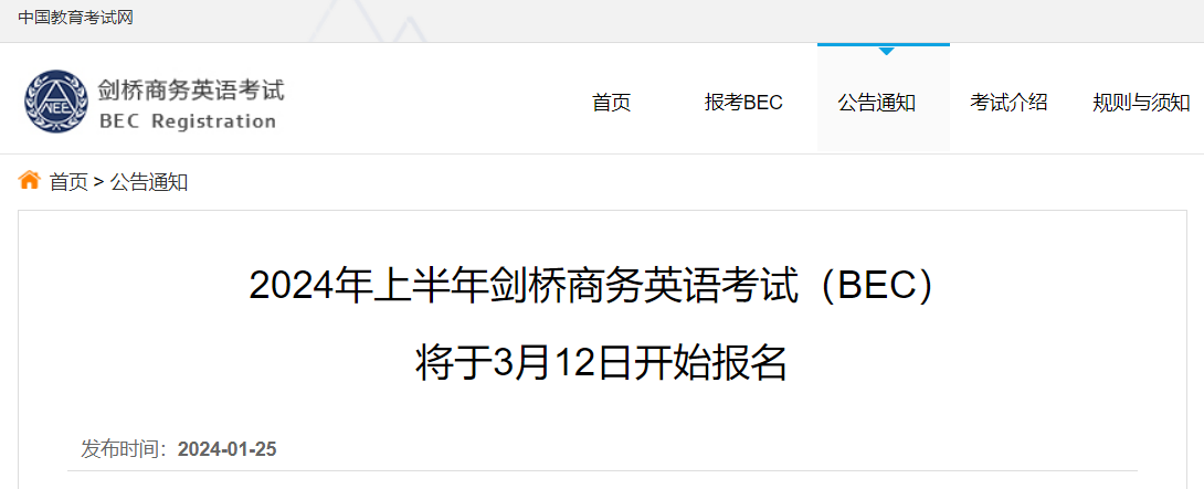 從中國教育考試網(wǎng)發(fā)布的《2024上半年商務英語考試(BEC)報名通知》得知,2024上半年浙江商務英語報名時間、條件、流程及入口已公布,3月12日-20日進行報名,具體詳情如下: